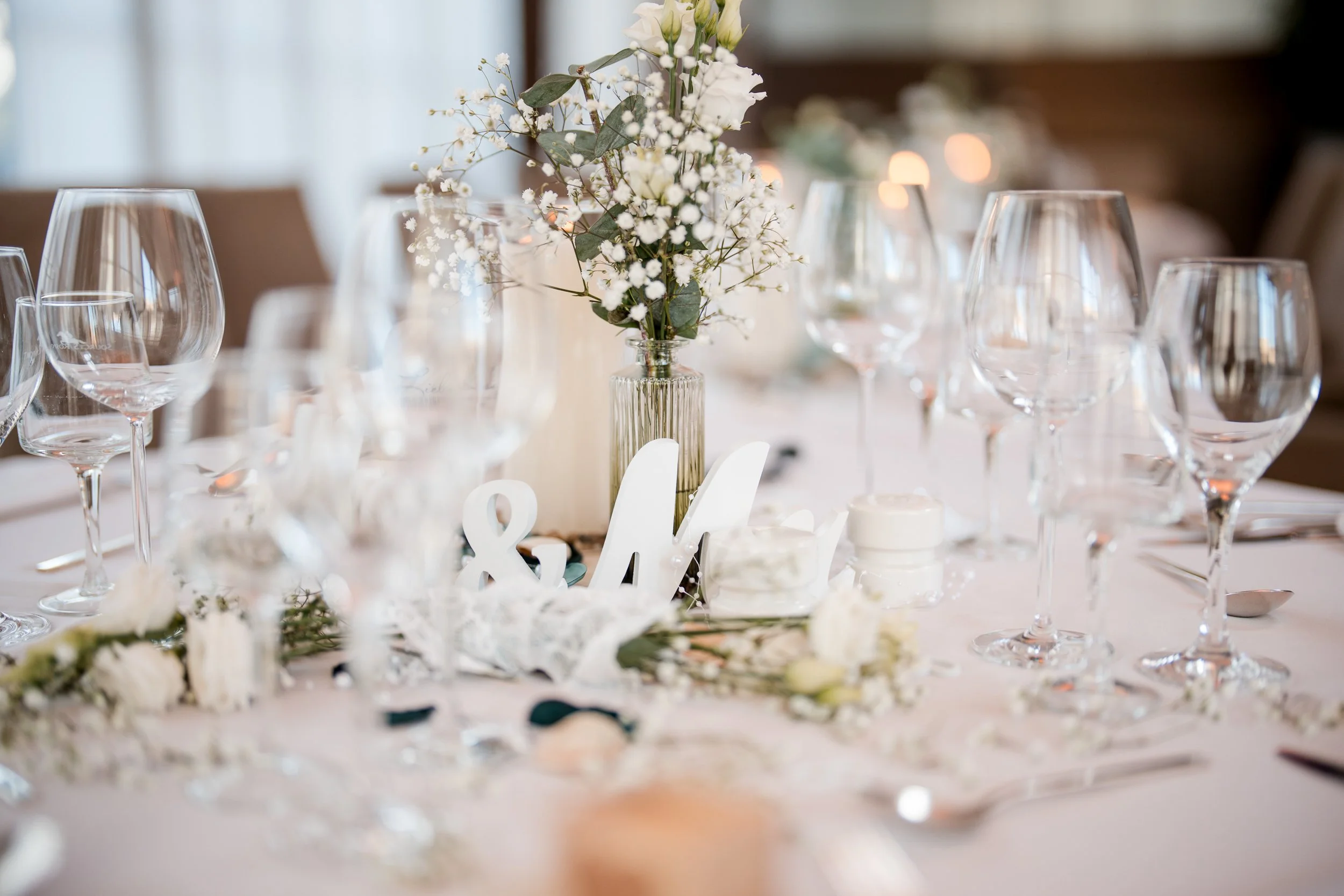 Ein festlich gedeckter Hochzeitstisch mit weißen Blumen, Kerzen, Gläsern und Besteck.
